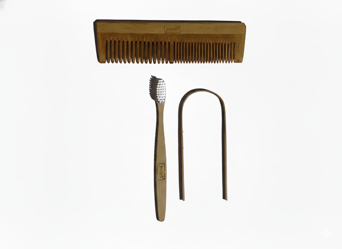 Neem Wood Lily Comb, Bamboo Wooden Toothbrush With White Bristles and Tongue Cleaner (Combo Pack)